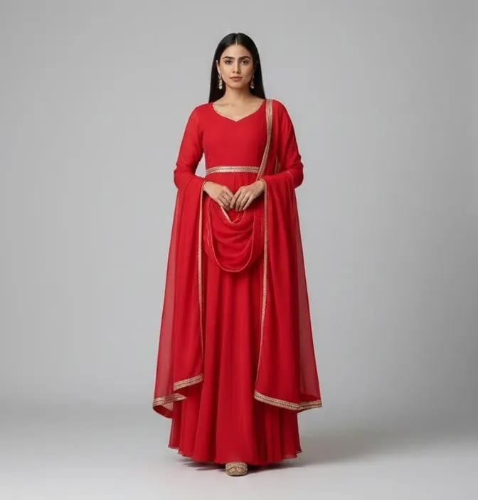 Product Description: Elevate your style with this stunning Women’s Chiffon Plain Maxi Suit. Featuring a round neck design, this set includes a flowing maxi, a beautiful dupatta, and comfortable trousers, all in a vibrant red color. Perfect for special occasions or casual outings, this 3-piece outfit ensures you stand out effortlessly. Experience comfort and style in one chic package!